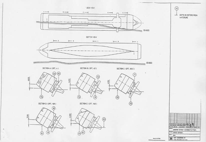 och till sist, däck no. 1 där man skar upp två hål i skrovet för att komma in. Men dykarna tilläts aldrig att titta på den flata botten eller styrbordssidan som stack upp ur lerbotten. Dykarna var naturligtvis också vid förrampen men som framgår av ovan illustrationer kunde de inte se styrbordssidan därifrån. Man skall ej heller glömma att dykningen skedde i december med bara 6 timmars dagsljus på ytan. Detta dagsljus försvinner till >90% nere på 60-80 meters djup, dvs det var hela tiden nödvändigt att arbeta med artificiellt