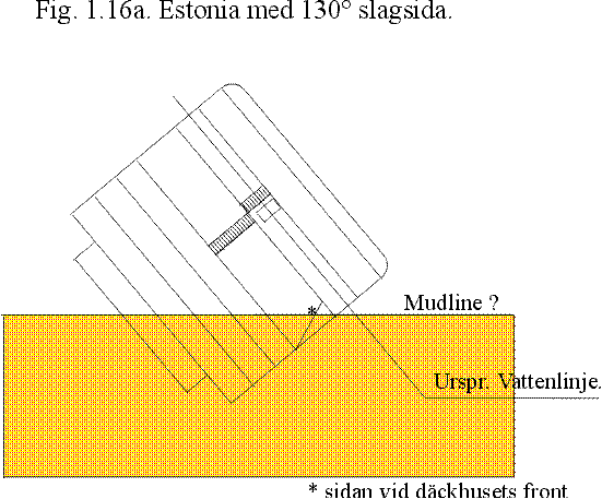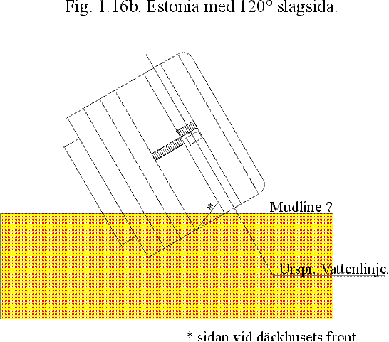 Uppgifterna var den påstådda skadan - hålet - befinner sig i styrbordssidan varierar. Enligt uppgift ligger 'Estonia' med styrbordssidan och ca 120-130° slagsida nertryckt i dyn. Frågan är var den s.k. mudline - havsbotten - befinner sig relativt vraket. Ovan ritning av Smit-Tak ger ju viss indikation och det verkar som om Bemis "öppning" skulle befinna sig i svackan på havsbotten mellan spant 109-140. I nedan figurer 1.16a (130° slagsida) och 1.16b (120° slagsida) är mudline lagd i skärpunkten mellan bildäck - däck 2 - och styrbordssidan. Enligt de senaste uppgifterna är skadan lokaliserad ca 30 meter från bogen vid den avbärarlist som befinner sig just vid däck 2 i mudline, där fartygssidorna är parallella. Det innebär att skadan skulle befinna sig ca två meter över den ursprungliga vattenlinjen i överbyggnaden, vilket knappast kunde ha lett till haveriet. Den skada i styrbordssidan som författaren anser orsakade skrovläckaget och som ledde till förlisningen borde finnas på däck 0-nivå strax ovan fartygets innerbotten, som alltså befinner sig minst 4-5 meter över mudline/havsbotten! Den skadan är inte stor - ca 0.3 m² stor - och kan vara svår att lokalisera i kolmörkret. Befinner sig skadan inne i stabilisatorlådan , som ligger helt åtkomlig, kan den ändå vara svår att hitta, eftersom stabilisatorfenan tydligen är i infällt läge. Fartyget smalnar av förut vilket innebär att bildäckssidan vid mudline blir vertikalare längre förut. Sidan vid däckshusets förkant är indikerad med en * och är cirka 15 meter från fören. Längre förut är bildäckssidan dubbel (försedd med utrymmen i sidan för diverse utrustning).